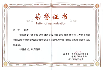 青年教师梁倩博士作为第一作者撰写的论文《基于偏好学习的大规模决策案例选择方法》获得大会优秀论文奖。