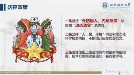 如今,作为一名大学生,我们更应一切行动听指挥,相信“动态清零”是我国当前抗击疫情的最佳选择,加强对各项疫情防控政策的了解。进入校园以来,学校实施了严格的防疫政策,让各项活动得到合理有序的开展。不论是在学生进入校园时对健康码的检查以及核酸检测,还是在教学活动开始后,为防控疫情开展网课教学,开设疫情方面的安全教育,都保障了校园稳定,安全的发展。新生入校时志愿者的周到热情,后勤各方服务的保障,都让学生感受到了家一般的温暖,感受到加入西财这个大家庭的踏实和安心。相信在我们的学校对疫情各方工作果断,精准,高效的领导下,全校师生必然可以众志成城,共克时艰,以实际行动为坚决打赢成都疫情贡献西财力量。