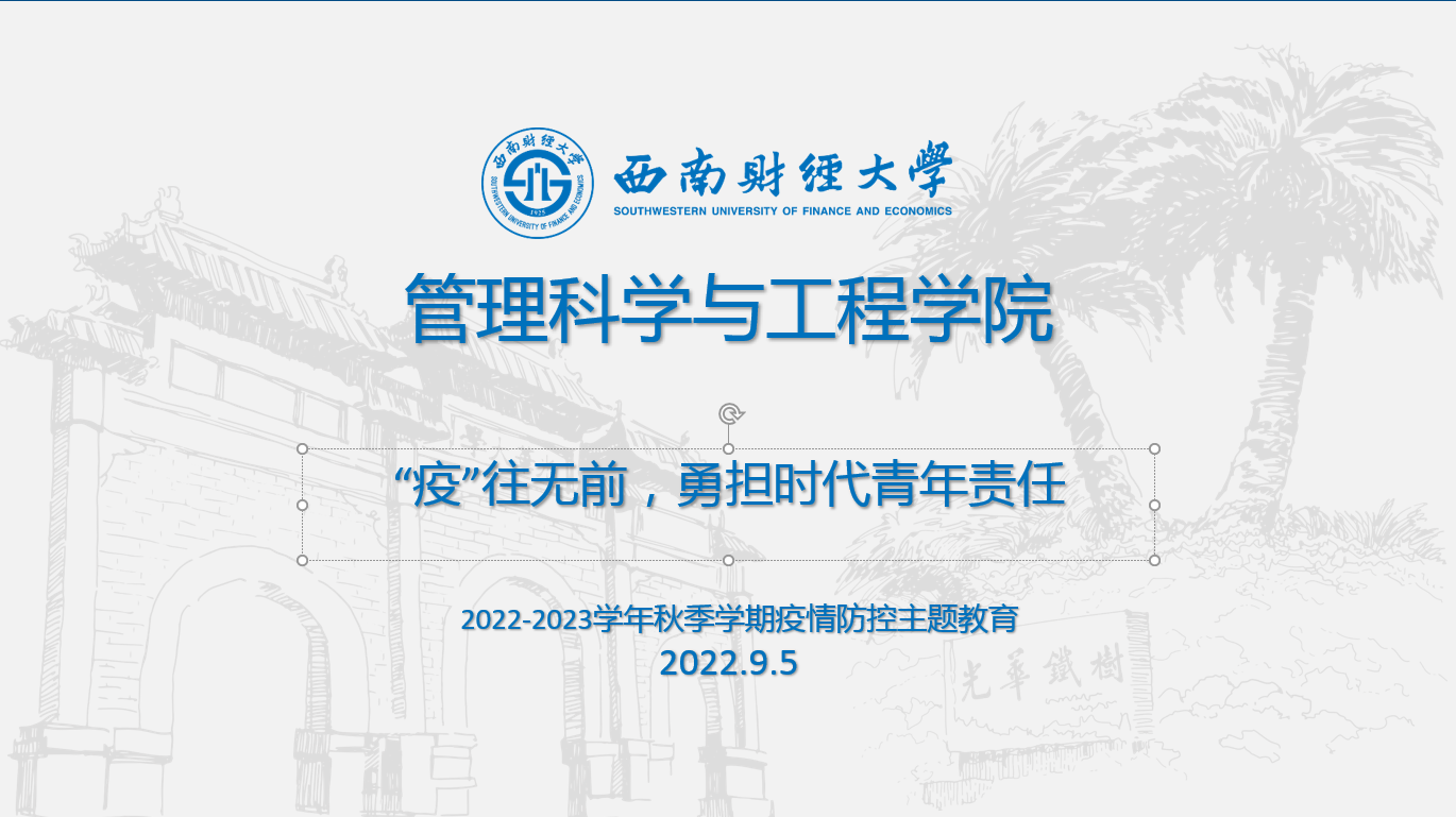 本次活动是学院响应学校党委统一部署,落实《成都市新型冠状病毒肺炎疫情防控指挥部通告(9月4日)》要求,加强2022级新生入学教育针对性的系列活动,学院以贯彻立德树人根本要求,教育引导新生坚定理想信念,厚植家国情怀,团结奋战,为社会和学校疫情防控积极贡献力量。