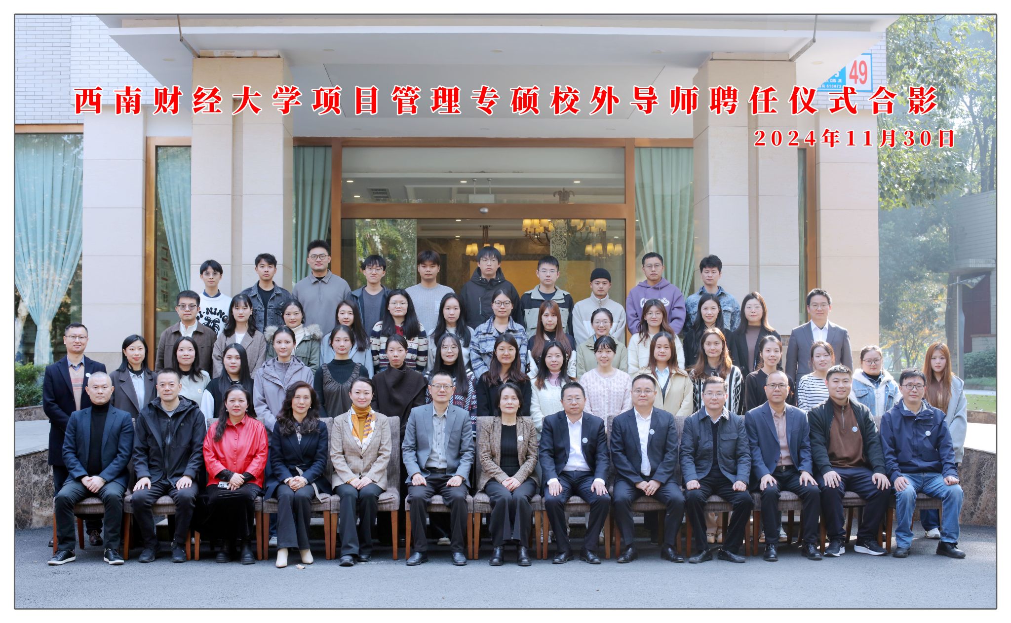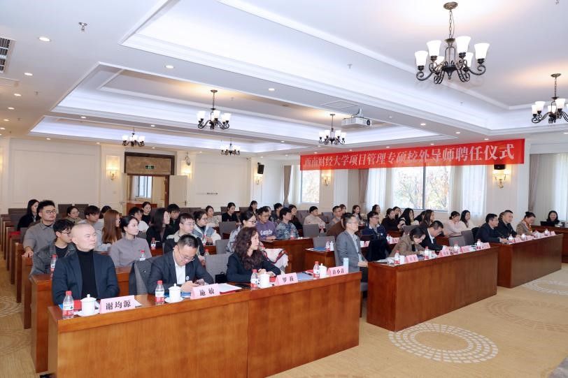 在光华校区住友苑成功举办项目管理专硕校外导师聘任仪式暨第一届项目管理知识竞赛颁奖仪式。成都市公共交通集团有限公司新都区巴士公交有限公司副董事长王尧、新网银行品牌市场部总经理许小青、中国人民财产保险股份有限公司四川省分公司副总经理牟蜀锋、四川和羲企业管理咨询有限公司总经理罗莉、北京大学汇丰金融研究院执行院长秘书钟凯扬、西藏正耀投资基金管理有限公司总经理施敏、四川五洲招标代理有限公司总经理顾娟、昆仑保险经纪股份有限公司四川分公司总经理谢均源8位行业优秀代表受邀出席。学院党委书记周敏、院长鲁万波、副院长王宇、部分教师代表以及2024级项目管理专硕全体学生共同参加。