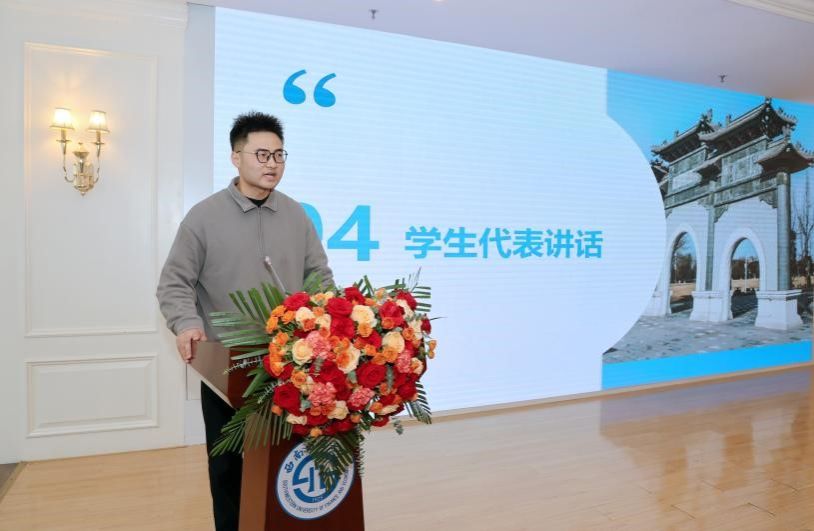 学生代表汪亚平同学上台发言,对学院提供的宝贵学习机会表示感谢,对校外导师的到来表示热烈欢迎。他表示,同学们期待与导师建立紧密联系,积极参与实践项目,明确职业规划,提升综合技能,为未来职场竞争做好充分准备。