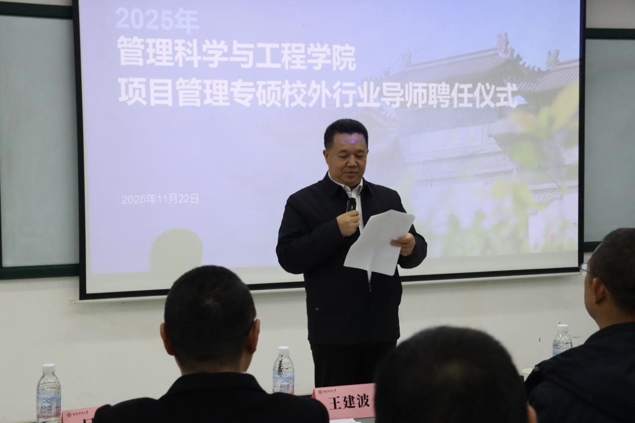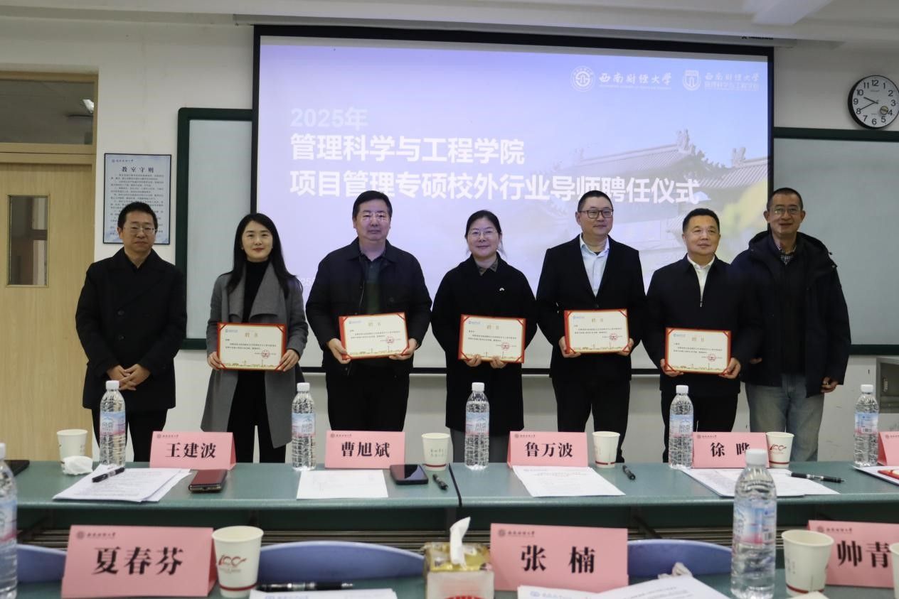 在光华校区成功举办项目管理专硕校外行业导师聘任仪式。成都超算中心运营管理有限公司董事长王建波、四川省电子商务协会常务副会长徐晔、成都映潮科技股份有限公司董事长吴超、四川映乡者文化传媒有限公司首席执行官刘渊、成都种智孵化器管理有限公司总经理夏春芬、中铁信托有限责任公司高级经理张楠等行业优秀代表受邀出席。学院党委书记曹旭斌,院长鲁万波,党委副书记、纪委书记袁程炜,教师代表及2025级项目管理专硕全体学生共同参加。