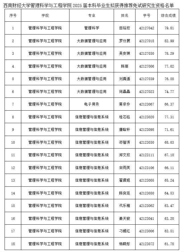 推荐免试研究生管理办法》和学院推免细则规定,经学院推免工作小组考核、公示及推荐,现将2025届本科毕业生拟获得推荐免试攻读研究生资格的同学名单公示于后(见附件)。